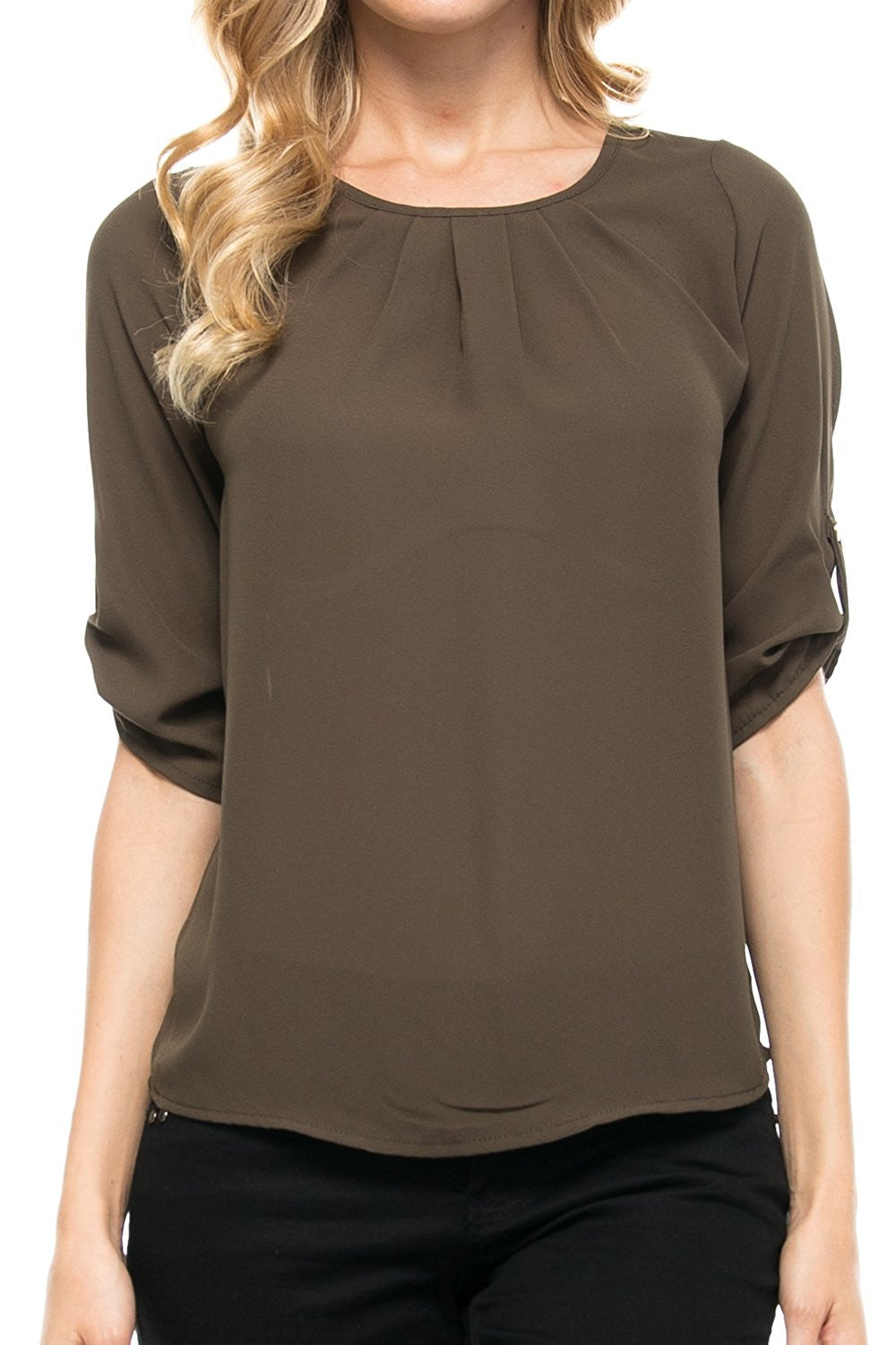 KLKD Women's Basic Chiffon 3/4 Sleeve Roll Up Blouse