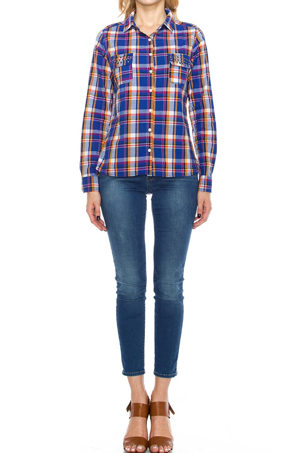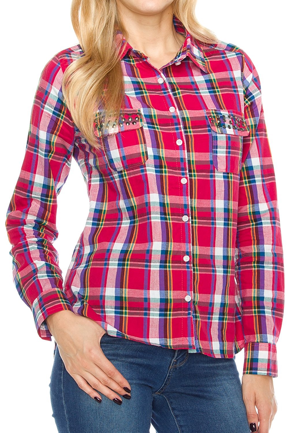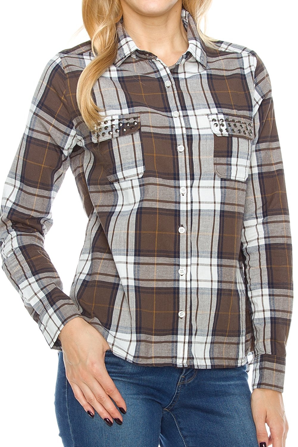 KLKD Women's Cotton Studded Flap Pockets Button Up Plaid Shirt Top